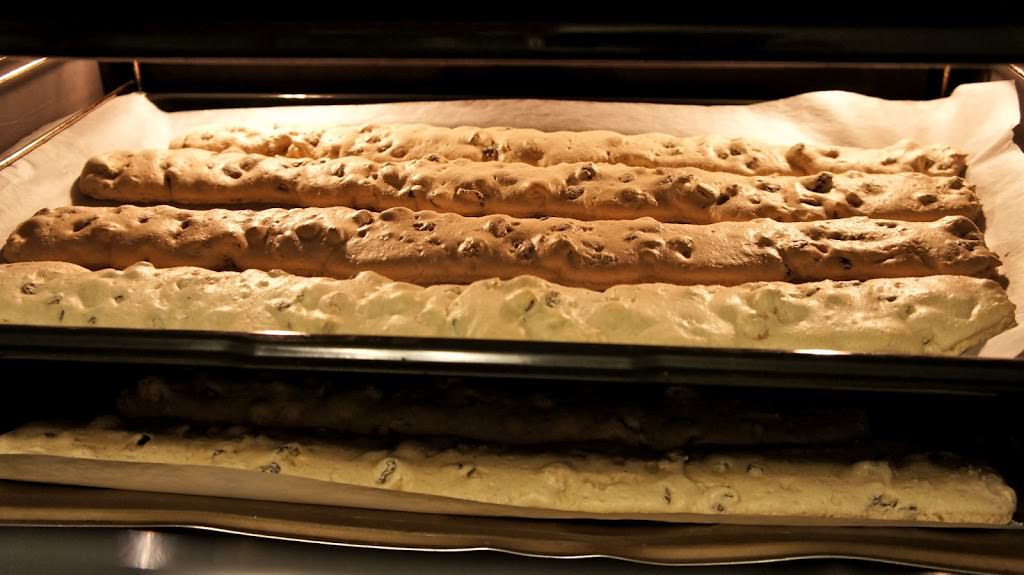 Incorporate al composto la frutta secca. Formate sulla placca dei filoni lunghi quanto la teglia utilizzando un sac-à-poche e cuocete a 190° per 15 minuti circa. A fine cottura tagliate a fettine diagonali e ripassate in forno a 150° per tostarli (io ci ho messo circa 15 minuti ancora).