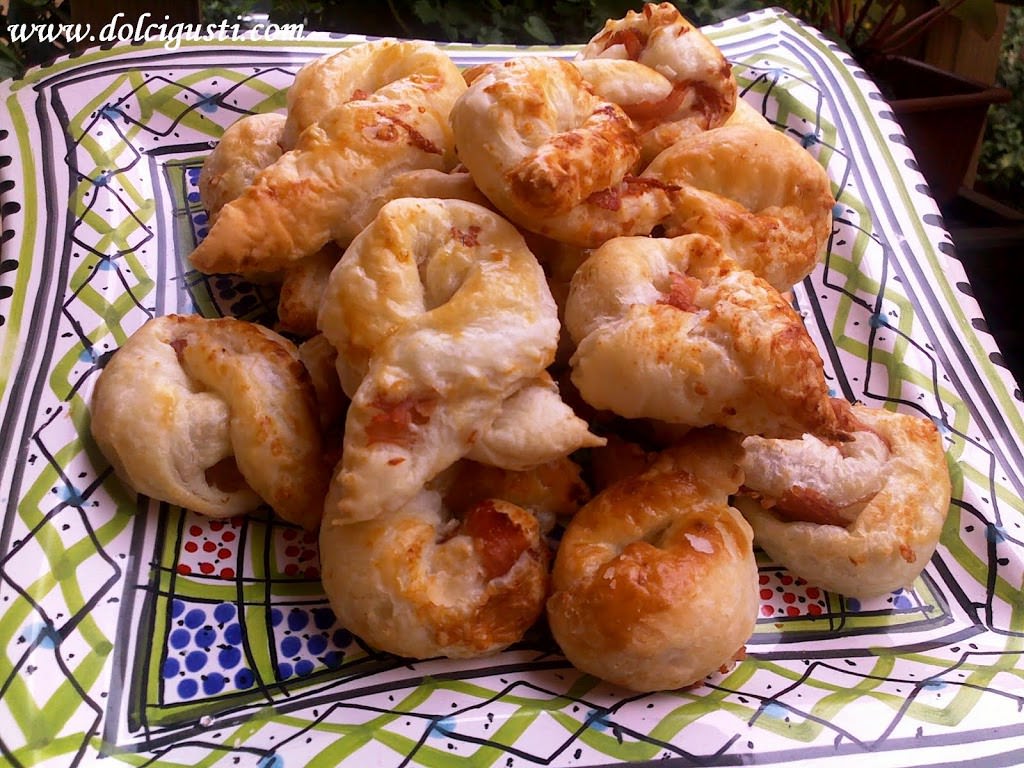 Cospargete della pasta sfoglia stesa a mm 3 di spessore con parmigiano grattugiato e pepe macinato; copritela interamente con fettine di prosciutto cotto poi tagliate insieme pasta e prosciutto con un tagliapasta dentato, ricavando dei triangoli rettangolari di cm 8 di lato.