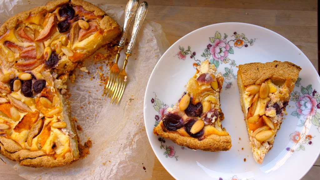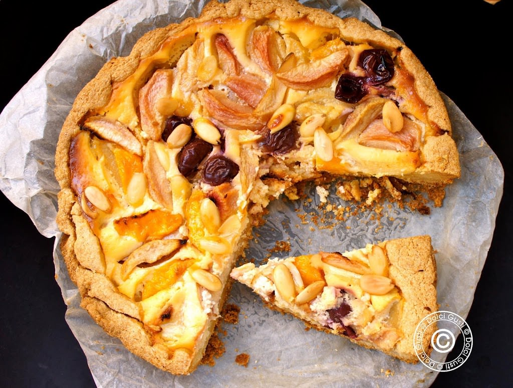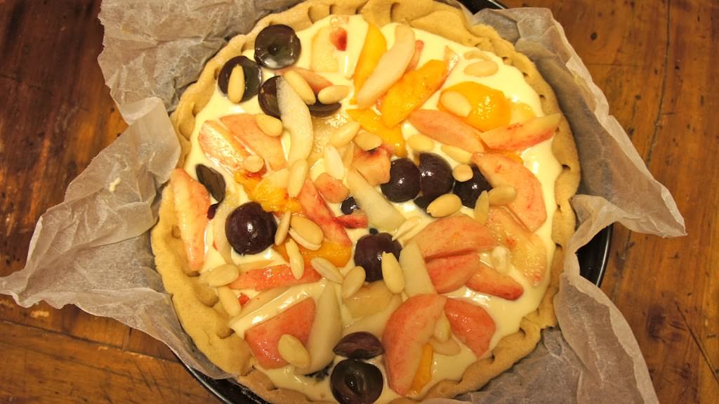 Prendete dal freezer la tortiera con la pasta frolla, versatevi la farcia di ricotta e tuffateci la frutta fresca che preferite (io: uva, pesca, pera, albicocca) spargete qualche mandorla e infornate a 175° per 1 ora circa; se dovete proseguire la cottura (ciò dipende dallo spessore che avete dato alla pasta frolla) coprite la superficie con un foglio di alluminio. Io l’ho cotta per circa 1 h e 20′.