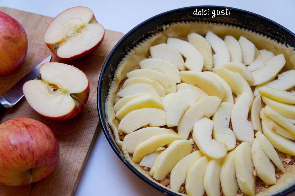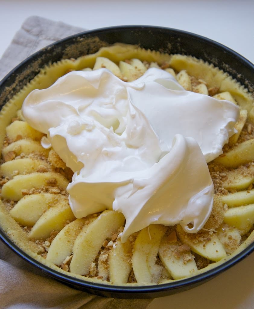Amalgamatevi con delicatezza lo zucchero a velo (io l’ho inserito abbassando la velocità della planetaria in 2 volte). Versate il composto sulle mele. Attenzione: questo passaggio vi darà un’enorme soddisfazione, con la spatola vi sentirete un po’ Dalì che dipinge sulla tela! Con la pasta avanzata chiudete i bordi con un cordoncino e fate delle striscioline per l’intreccio. Spennellate con il tuorlo sbattuto.