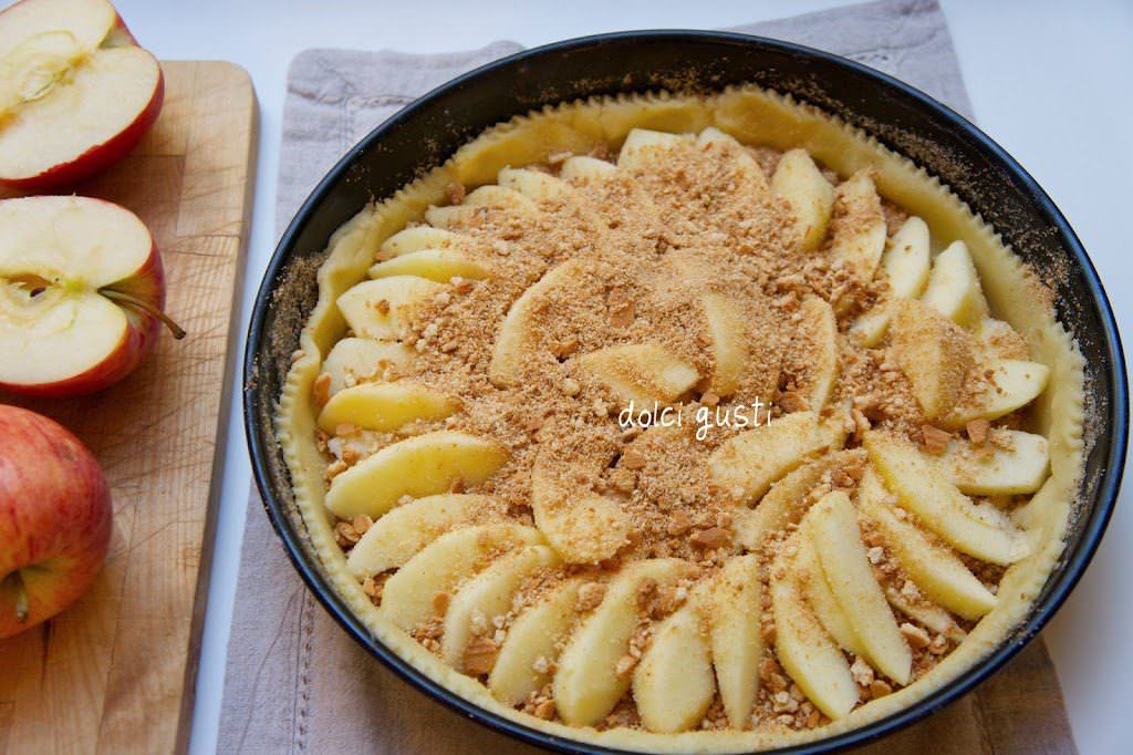 Preparate la pasta mescolando a mano o in planetaria tutti gli ingredienti. Raccoglietela a palla e fatela riposare per un’ora. Imburrate uno stampo di 22 cm e spolverizzatelo di pangrattato facendolo aderire bene alle pareti. Scuotete il recipiente per eliminare l’eccesso. Stendete 3/4 di pasta fino a ricavare un disco poco più grande dello stampo e foderatelo fino a ricoprire anche parte delle pareti. Spolverizzate con poco più della metà dei savoiardi sbriciolati. Sbucciate le mele e tagliatele a fettine. Distribuitele sui savoiardi e spolverizzate con i savoiardi restanti.