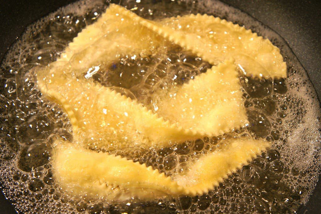 Fate scaldare l’olio e quando avrà raggiunto la temperatura di 180°, prendete le frappe una ad una in mano rigirandole su loro stesse e formando un torciglione; immergetele 3-4 alla volta nella padella.