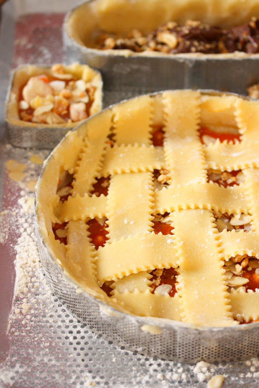 La variante nella pasta frolla con cui mi piace giocare sono i differenti zuccheri, le farine e la frutta secca. Qui la fa da padrone la mandorla, il pistacchio e una farina biologica macinata a pietra dura. Non essendo bianca, conferisce alla torta un delizioso colore beige, che in cottura diventa un croccante marrone da sgranocchiare.