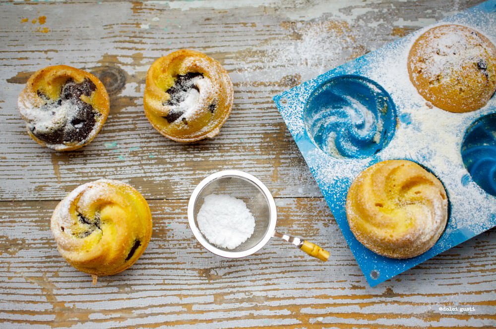 Imburrate e infarinate gli stampini. E versate alternativamente i due composti senza riempire del tutto gli stampini.