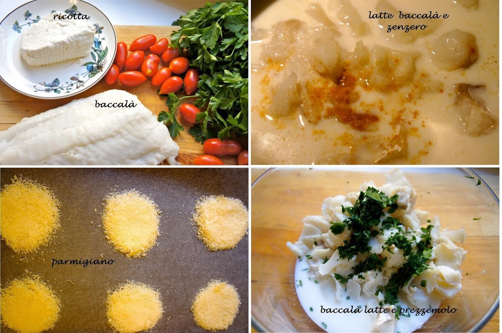 Sciacquate bene il baccalà e togliete le spine residue. Tagliatelo a tocchetti e cuocetelo nel latte a fiamma bassa per circa 25 minuti, con i 2 cucchiaini di zenzero. Intanto su una teglia foderata di carta da forno, formate dei cerchi con un cucchiaio di parmigiano, ne vengono 6. Allargateli e cuocete in forno a 200° per 5/7 minuti, attenzione che non si brucino. Capovolgeteli sopra alcune tazzine rovesciate e fateli raffreddare così che assumano la forma di cestini.
