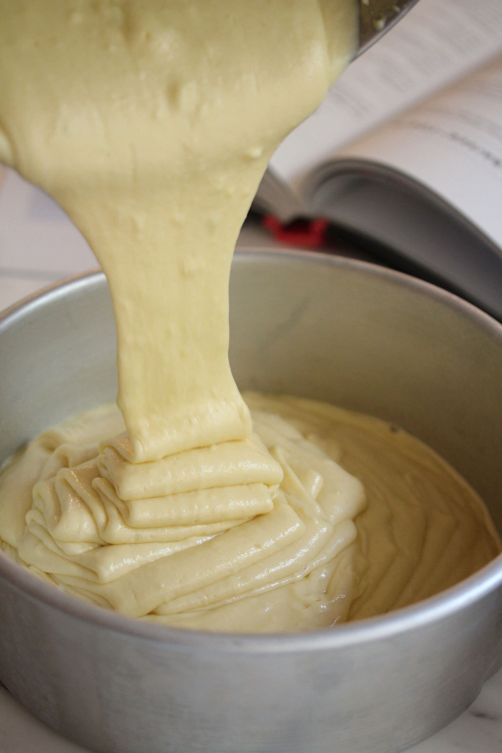 Imburrate ed infarinate la teglia. Versate dentro l’impasto e battete leggermente la teglia sul tavolo per eliminare le bolle d’aria.