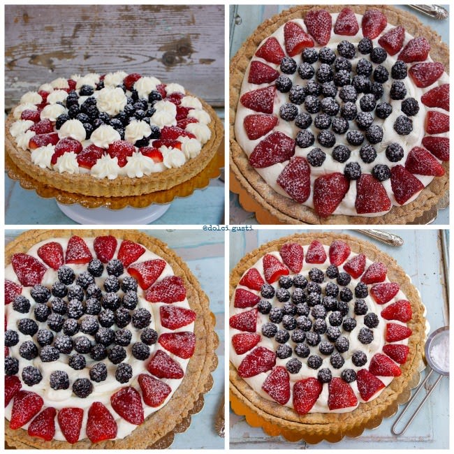 Decorate la crostata con un sac à poche con la namelaka facendo dei giri concentrici, al di sopra disponete la frutta a piacere. Spolverizzate con zucchero a velo.