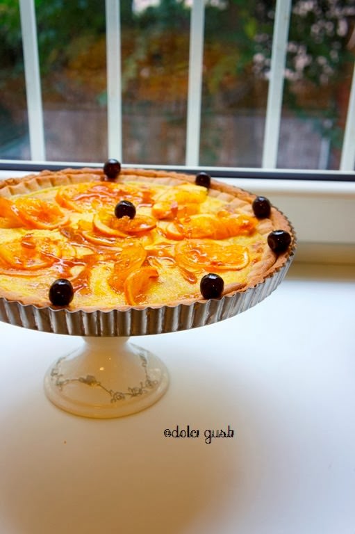 Riprendete la pasta frolla e foderateci la tortiera imburrata e infarinata. Procedete con la cottura in bianco a 190° per 20 minuti. Tirate fuori dal forno e riempite il guscio con la marmellata e poi con la farcia di mascarpone all’arancia. Finite la cottura in forno per altri 25 minuti circa fino a che la crema si dorerà. Prendete le fettine di arancia e decorate la tarte appena tolta dal forno. E disponete le amarene.