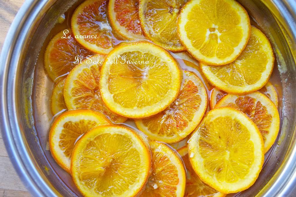 Nel frattempo preparate l’arancia caramellata. Fate delle fettine molto sottili e a fuoco basso cuocetele con l’acqua e lo zucchero fino a che avranno assorbito gran parte del liquido. Prendetele con delle pinze e mettetele ad asciugare su una gratella posta su un piatto. Come nella foto.