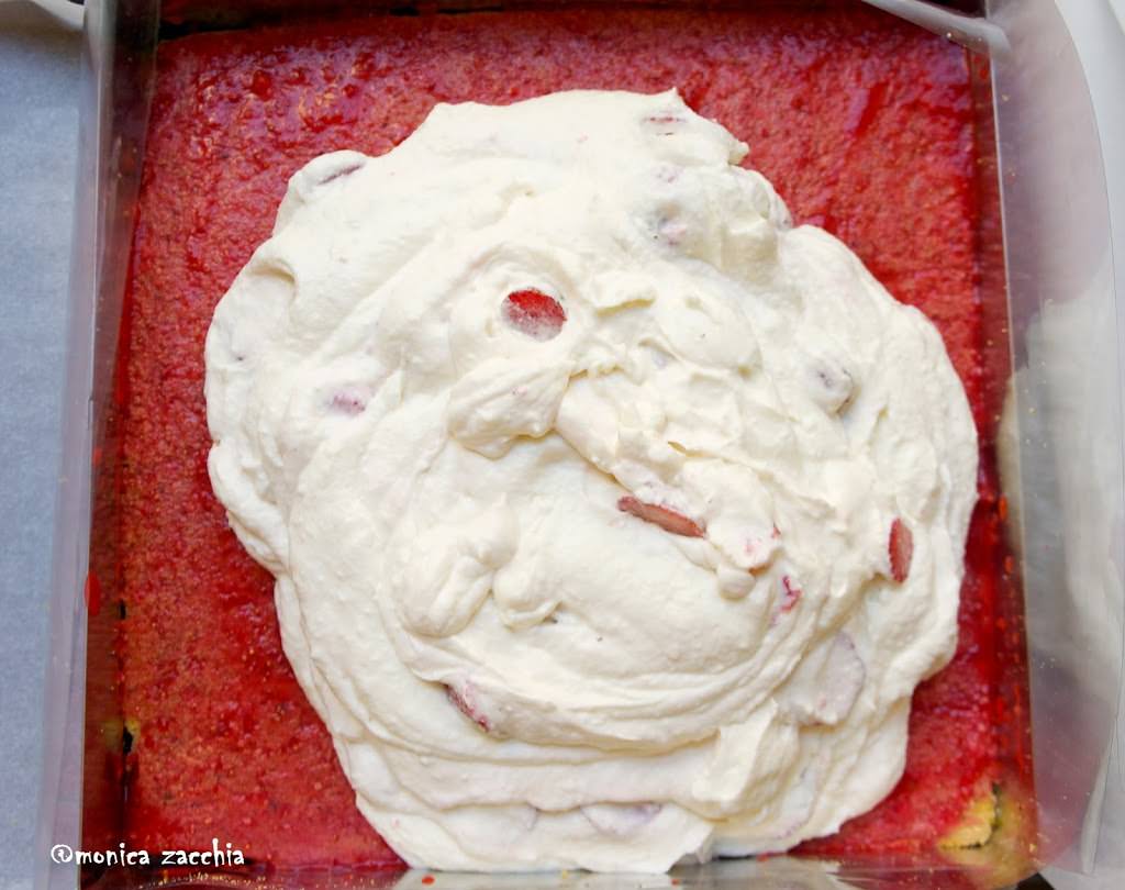 Servitevi di uno stampo in acciaio, della forma che preferite. Io ne ho usato uno quadrato di 25 cm di lato. Utilizzatelo per ritagliare dalla pasta biscotto due basi. Sistemate la prima base dentro lo stampo, poggiato su una teglia ricoperta con carta da forno come nelle foto sopra (la teglia deve avere un bordino che li contenga per evitare che fuoriesca la gelatina di fragole). Spennellate il biscotto con la bagna alle fragole. Spalmate sopra lo strato di mousse di ricotta. Poggiate sopra la seconda base di pasta biscotto e inumiditela con la bagna. Mettete in frigo. Ora montate la panna che serve a stemperare la crema pasticciera. Unitela alla crema con una frusta a mano e spalmatela sopra la torta. Mettete in frigo.